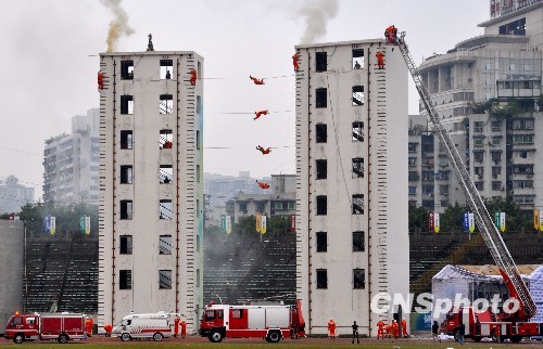 图为高层建筑灭火救援中,消防官兵钩梯联挂展开高楼营救工作。中新社发 曹多然 摄