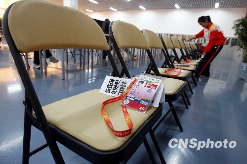 10月24日,第十一届全运会110米栏预赛即将举行,因刘翔将首次亮相赛场,众多摄影记者为申领场地摄影“黄马甲”,提前七小时来到新闻中心用椅子和证件排起长龙。 中新社发 张宇 摄