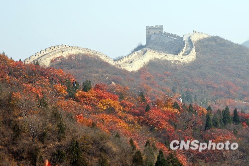 2009年10月24日,北京八达岭长城旁的红叶岭进入秋叶最佳观赏期,吸引大批游客。 中新社发 余明 摄