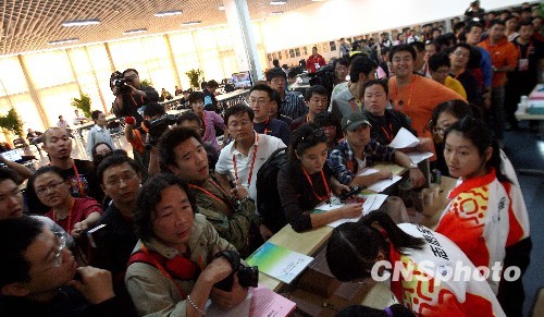 10月25日,为了能够采访到刘翔今晚的赛事,媒体记者在排长队等候发放入场采访证,场面一时陷入混乱。本届全运会最大的焦点战役——男子110米栏决赛即将在今晚8点开战,中国飞人刘翔将第三次走上全运会的决赛赛场。