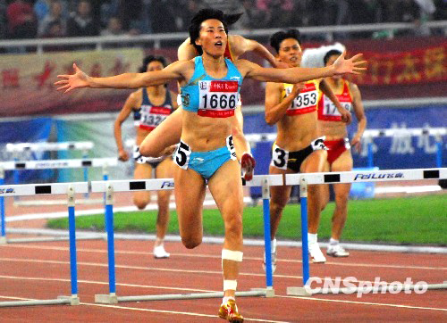 10月25日晚,山东选手黄潇潇在全运会女子400米栏决赛中以55秒49的绝对优势获得冠军,这是她继400米之后的第二金。中新社发 崔鹏森 摄