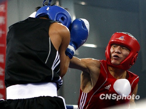 10月26日,十一届全运会拳击比赛在山东交通学院体育馆举行,在57KG级别决赛中,来自北京的李洋战胜了辽宁选手刘强夺冠。中新社发 刘震 摄