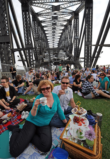 澳大利亚六千名群众25日早上齐集举世闻名的悉尼港大桥,坐在绿油油的草地上享受早餐。