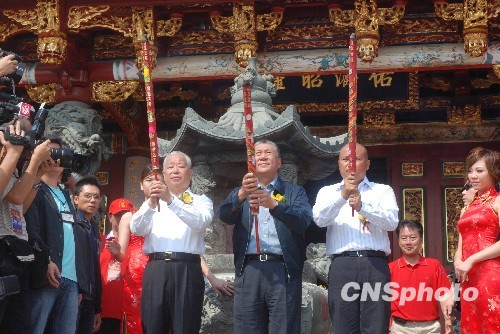 第七届澳门妈祖文化旅游节开幕式暨妈祖祭典仪式,十月二十六日在澳门叠石塘山妈祖文化村天后宫盛大举行。澳门特区行政长官何厚铧(中)在澳门中华妈祖基金会主席颜延龄(左)及副主席陈明金的陪同下祭典妈祖并上头香,为澳门祈福。中新社发 毕永光 摄