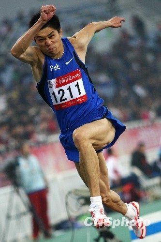 10月26日,全运会田径男子三级跳远决赛在济南奥体中心体育场进行,河北队李延熙发挥出色,打破了尘封28年的全国纪录(17.34米)夺得冠军,成绩为17米59。中新社发 富田 摄