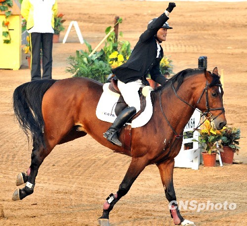 广东“农民马王”李振强驾驭新马“天王星”完成比赛时挥舞拳头庆祝,他于10月27日在济南十一届全运会马术场地障碍个人赛荣获亚军。他的千万重金主力马“珍匹”,10月11号突然结肠发病没救回来,悲痛中的他与新马磨合仅十几天后连夺团体金牌和个人银牌。李振强在比赛中默默叫“珍匹”的名字,祈祷它的在天之灵保佑获胜。中新社发 贾国荣 摄