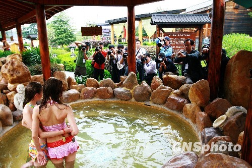 来自来自全球五大洲40多个国家和地区的超级模特在江西庐山天沐温泉身着泳装,尽情戏水。中新社发 张俊 摄
