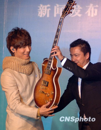 图为华谊兄弟传媒集团CEO王中磊将一把价值不菲的Fender电吉他赠予陈楚生,希望他能用这把吉他在未来带给大家更多好的原创音乐。中新社发 李学仕 摄