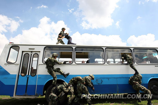 8时10分,特战队员到达现地后,立即听取联指情况报告后,侦察组迅速对楼内情况通过软管窥镜等仪器对楼内情况进行周密侦察,准确地掌握了危险分子位置和人质情况。封控1组立刻对该公司周边街道、办公室、餐厅实施封控。突击队员迅速占领有利位置,伺机毙敌,解救人质。封控2组迅速展开行动,封控3组2名特战队员开始利用盾牌掩护向实验楼推进,另1名队员利用防弹车天窗架设好机枪;封控4组利用车体和建筑物交替掩护,对办公楼正面实施封控;封控5组成二线配置,在迂回封控时,遇到铁丝网拦路,特战队员及时利用多功能剪切钳破障后,分别设置了遥控阻车钉和蛇腹形隔离网,完成对道路西侧、东侧的封控;封控6组成纵深配置,设置移动阻车器材和车载式金属防暴隔离网墙实施封控。8时20分,6个封控小组完成了对整个事发地域的紧急封控,布下了天罗地网,危险分子插翅难逃。