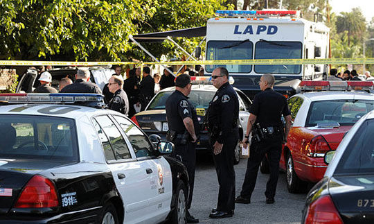 10月29日,美国洛杉矶一犹太人聚会场所发生枪击事件,两名犹太人受伤。图为警察在枪击事件现场警戒。