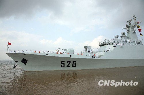 2009年10月30日上午,中国海军“马鞍山”号、“温州”号两艘新型导弹护卫舰从浙江舟山东海舰队某军港解缆启航,远赴亚丁湾、索马里海域执行护航任务。“马鞍山”舰和“温州”舰将与正在亚丁湾执行第三批护航任务的“千岛湖”号综合补给舰,以及两架舰载直升机、数十名特战队员等组成中国海军第四批护航编队,整个编队共计700多人,接替第三批护航编队执行在亚丁湾、索马里海域的护航任务。中新社发 孙自法 摄