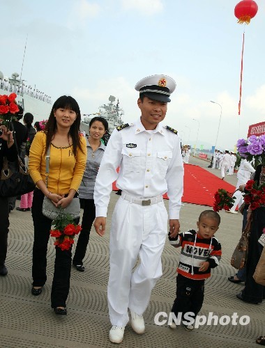 一位护航官兵与前来送行的孩子牵手从军港码头上走过,场面温馨。 中新社发 孙自法 摄