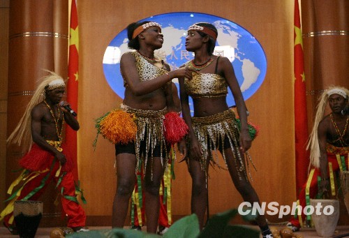 10月31日,乌干达歌舞团来到中国外交部,在以往都是新闻发言人登台的新闻发布厅表演热辣的非洲歌舞。当日,外交部举行“中非合作论坛”主题公众开放日,非洲各国驻华使节也应邀到场。中非合作论坛第四届部长级会议将于11月8日在埃及沙姆沙伊赫开幕,温家宝总理将出席开幕式。中新社发 苏丹 摄