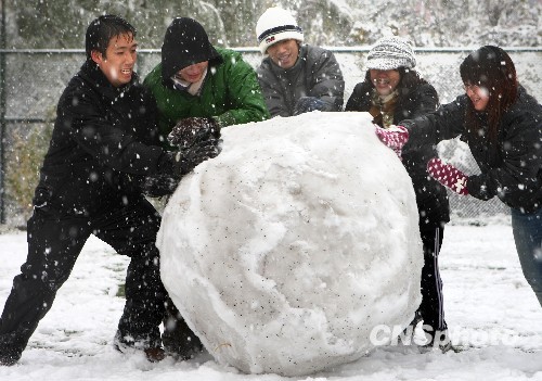 11月1日,尚未立冬的北京受强冷空气影响大雪纷飞银装素裹,几名来自赤道印尼的年轻人滚起硕大的雪球享受罕见的雪中乐趣。中新社发 任晨鸣 摄