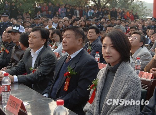 图为在发布会现场,梁山居民争相一睹明星芳容,连墙头屋顶都站满了人。中新社发 李学仕 摄