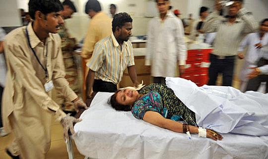 相撞事故中受伤的巴基斯坦人在卡拉奇一所医院内接受治疗。