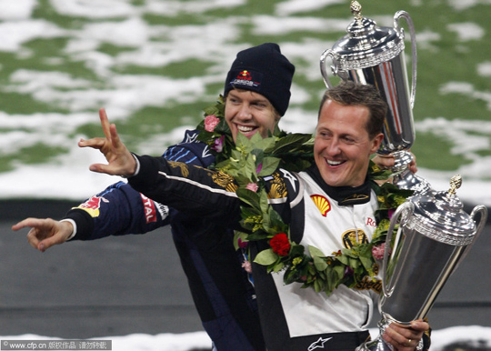 11月3日晚,北京鸟巢迎来2009 ROC车王争霸赛。作为每年世界职业车坛压轴戏和年终庆典,世界车王争霸赛的分量极重。本届赛事邀请到了舒马赫、巴顿、维特尔等明星车手。他们将在鸟巢进行真正的“王中王争霸赛”。ROC包括车手杯和国家杯两项比赛。车手杯赛由世界顶级车手以个人身份参赛,进行一对一对决,最终获胜者赢得当年世界车坛的“王中王”称号。国家杯赛由多支国家队(每队两名车手)分组进行三局两胜的捉对厮杀,最终获胜者赢得国家杯。图为德国代表队车手舒马赫、维特尔一路过关斩将,夺得国家杯冠军。