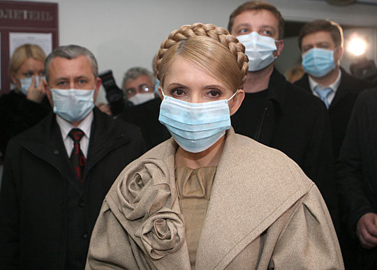 图为乌克兰总理季莫申科抵达乌克兰甲流重灾区的一所传染病医院,看望甲流患者。