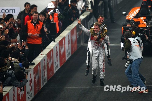 2009年ROC世界车王争霸赛北京时间11月4日晚在北京鸟巢上演车手杯争夺战,来自世界汽车运动顶尖级选手在为期三天的赛事中,展开激烈竞争。来自瑞典的DTM(德国房车大师赛)悍将埃克斯特罗姆在决赛中2比0战胜F1七冠王舒马赫,第三次夺得车坛“王中王”称号。图为获胜后埃克斯特罗姆背起了舒马赫,一同庆祝胜利。 中新社发 富田 摄