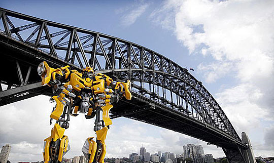 变形金刚“大黄蜂”在澳大利亚悉尼港大桥前“现身”。