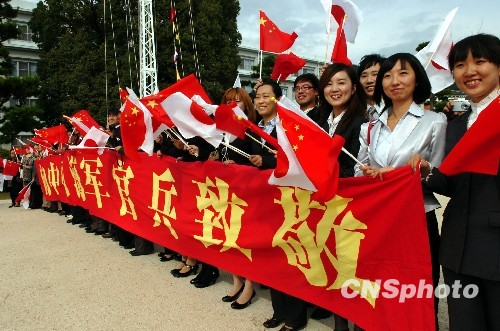 图为当地华人华侨手持两国国旗迎接中国海军官兵的到来。中新社发 朱沿华 摄