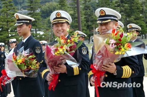 图为此次出访指挥员、中国海军副总参谋长刘毅少将(中)等人接受日方赠送的花束。中新社发 朱沿华 摄