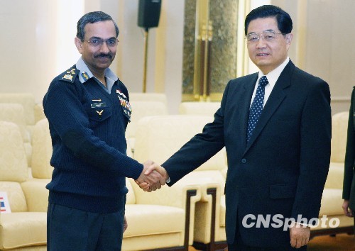 11月6日,中国国家主席、中央军委主席胡锦涛,在北京人民大会堂会见应邀前来参加庆祝中国人民解放军空军成立60周年“和平与发展国际论坛”的巴基斯坦等30国空军代表团团长,代表中国政府和军队对各位贵宾的到来表示热烈欢迎。