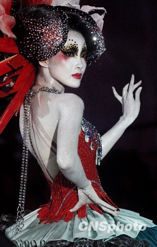 11月5日,在北京举行的中国国际时装周2010春夏系列发布上,举行2010毛戈平MGPIN彩妆造型发布,打造了一场化妆造型视觉盛宴。图为模特展示彩妆造型作品。 中新社发 钱兴强 摄