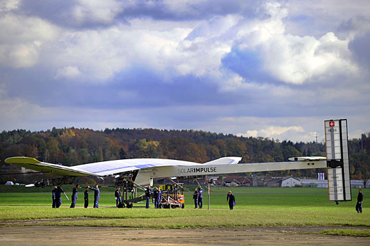 瑞士当地时间11月6日,一架新型的太阳能飞机出现在了瑞士的一个机场跑道上。该飞机自重1500公斤,将以70 公里/时的速度飞行,飞行高度可以达到8500米。