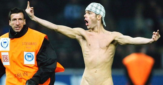 图为一名愤怒的柏林赫塔球迷冲进球场内疯狂的裸奔。