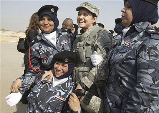 图为伊拉克女警察在毕业典礼上与美军女教官合影。