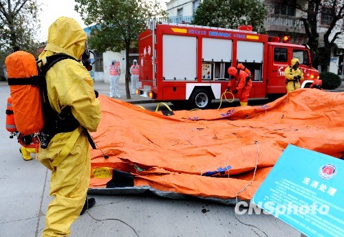 图为消防官兵在连云港市宿城乡演习现场搭建消洗帐篷。 中新社发 耿玉和 摄
