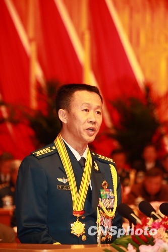11月11日,英模代表“英雄试飞员”李中华在空军成立60周年大会上发言。中新社发 谭超 摄