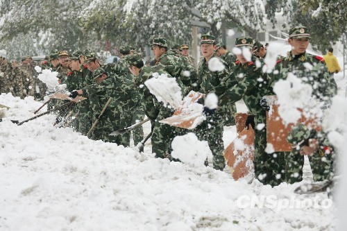 图为当地党正机关、驻军部队、武警纷纷走上街头清扫积雪。中新社发 余洪恩 摄