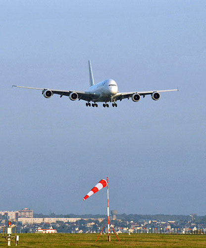 图为11月11日,空中客车A380飞机降落在法国巴黎奥利机场。