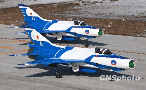 图为八一飞行表演队歼七飞机升空。中新社发 卢炳广 摄