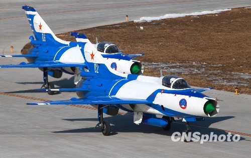 图为八一飞行表演队歼七飞机升空。中新社发 卢炳广 摄