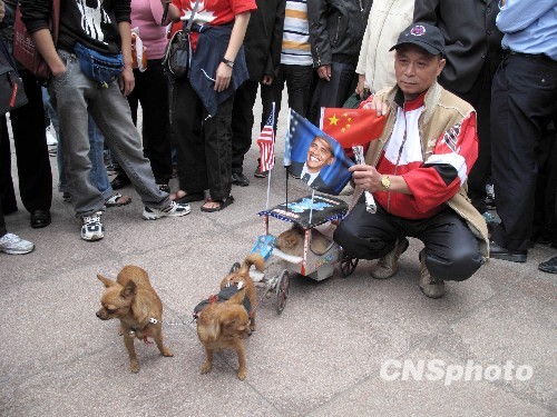 2009年11月12日下午,上海市民王先生在上海南京东路步行街展示他制作的小彩车欢迎奥巴马访华,路人纷纷驻足观赏。他表示明年他还要重新制作一辆小彩车在世博会期间进行展示。