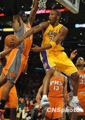 当地时间11月12日晚,洛杉矶湖人队主场迎战菲尼克斯太阳队,以121比102轻取对手。科比只上场32分钟,拿下29分。中新社发 张炜 摄