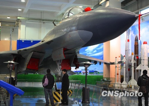 中国人民解放军空军11月13日组织驻北京记者参观中国航空博物馆,国产歼-11飞机吸引观众。在中国人民解放军空军成立60周年期间,由于整修和接待相关人士,这所博物馆暂时停止对外开放一段时间,本月15日起将以崭新的面貌对公众人士开放。这座世界排名前五位、亚洲第一的大型航空博物馆,1989年正式对公众开放,目前馆内收藏134个型号的309架飞机及导弹、雷达等各类武器装备样品和重要的友好往来航空礼品15000余件。中新社发 宋吉河 摄