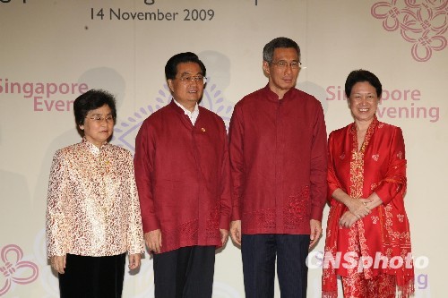 十一月十四晚,新加坡总理李显龙伉俪在滨海艺术中心迎接中国国家主席胡锦涛和夫人刘永清,出席观看《新加坡之夜》。中新社发 郑祚声 摄