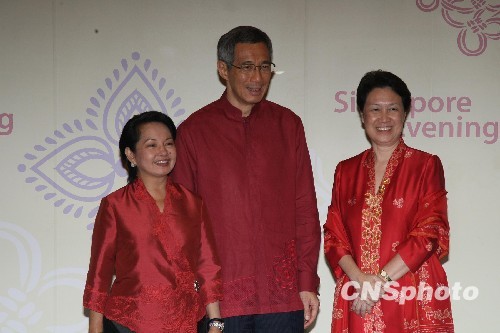十一月十四晚,新加坡总理李显龙伉俪在滨海艺术中心迎接菲律宾总统阿罗约,出席观看《新加坡之夜》。中新社发 郑祚声 摄