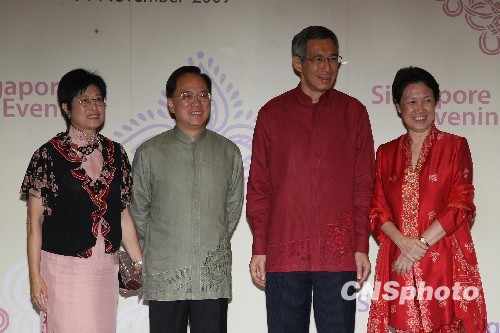 十一月十四晚,新加坡总理李显龙伉俪在滨海艺术中心迎接中国香港特区行政长官曾荫权和夫人曾鲍笑薇,出席观看《新加坡之夜》。中新社发 郑祚声 摄