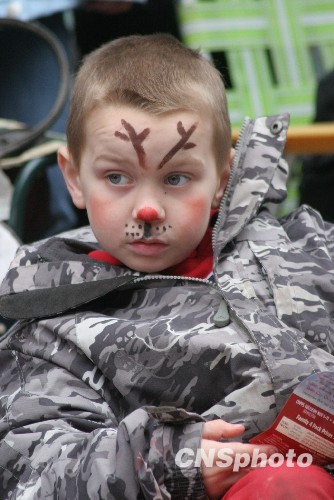 脸上用巧克力涂上图案的五岁小男孩吉米,当地时间十一月十五日上午十点多就和他的家人带着折叠椅和毛毯,来到多伦多的市中心的街边,耐心等待圣诞老人在多伦多的第一百零五次大巡游。中新社发 赖海隆 摄