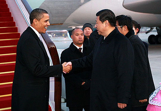 11月16日下午,美国总统奥巴马乘专机从上海飞抵北京,国家副主席习近平前往北京首都国际机场迎接。