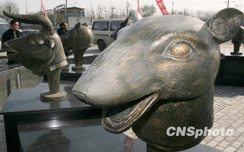 11月18日,一组仿制的圆明园兽首铜像在北京一超市门口树立。圆明园十二生肖铜兽首于清乾隆年间制成,是圆明园海晏堂外喷泉的一部分。今年年初,圆明园鼠首和兔首铜像在法国被拍卖,曾引发网友热议。中新社发 苏丹摄