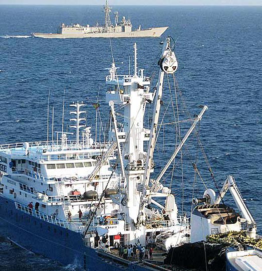 11月17日,在索马里海域,西班牙渔船“阿拉科拉纳”号(前)在西班牙军舰的护卫下航行。