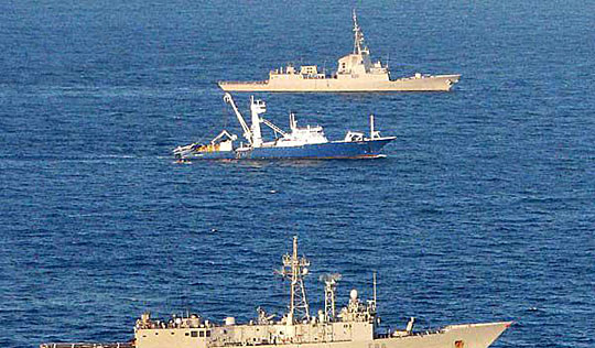 11月17日,在索马里海域,西班牙渔船“阿拉科拉纳”号(中)在两艘西班牙军舰的护卫下航行。