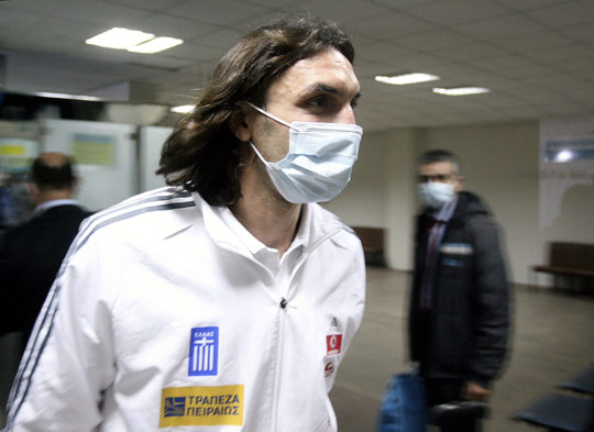 由于乌克兰流感疫情严重,17日抵达乌克兰的希腊队员全体戴上了口罩。