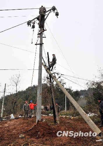 11月18日,电力工人和湖北南漳县农民紧密配合抢修雪毁线路。11月15日,南漳县普降大到暴雨雪,严重的冰冻,造成输电线路严重受损,601个台区停电,52770户居民用电受到影响。受灾最严重的薛坪镇,8000余农户35000人口因雪灾造成直接经济损失2000余万元。灾情发生后,当地政府立即成立抗灾自救指挥部,全力投入抗灾自救。预计本月22日将全面恢复供电。